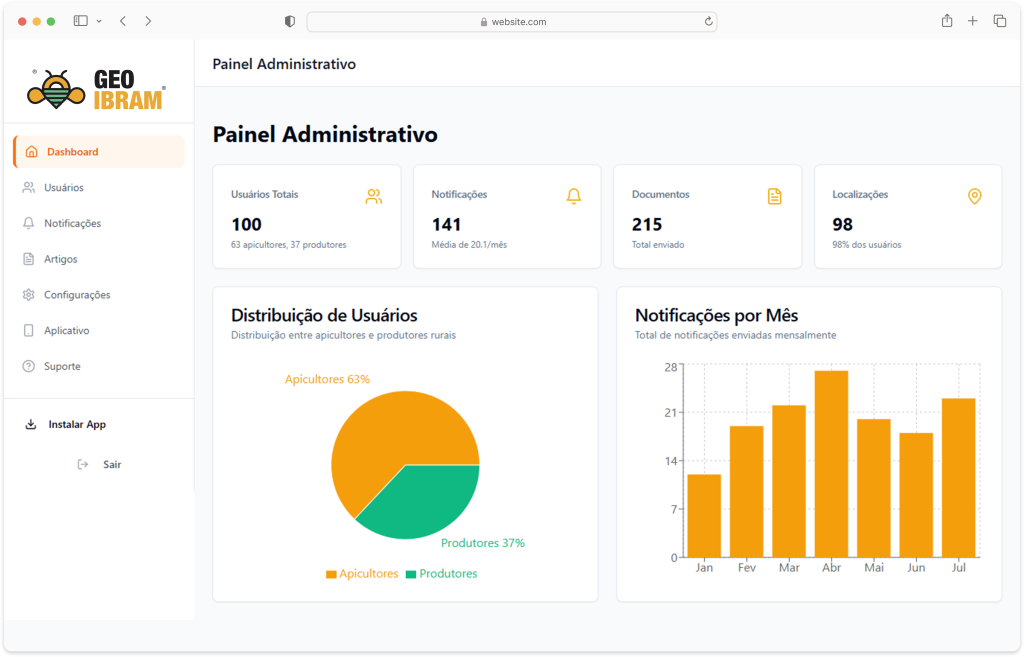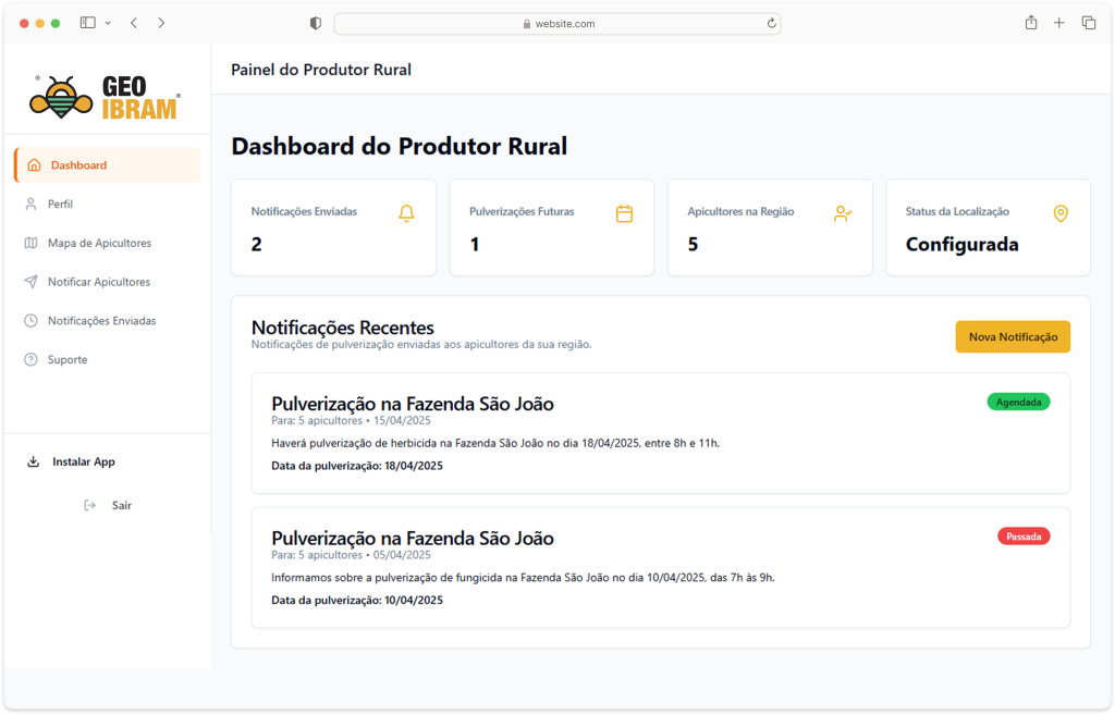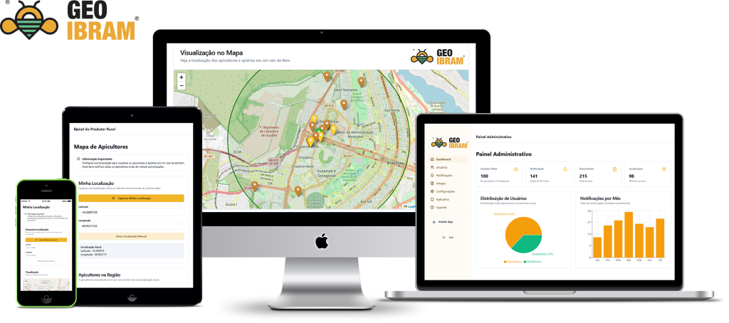 O GEOIBRAM (Sistema Georreferenciado de Comunicação Rural do Instituto Brasileiro de Apicultura e Meliponicultura – IBRAM) é uma plataforma digital inteligente criada para promover a convivência harmoniosa entre produtores rurais e apicultores. Através de um sistema interativo baseado em geolocalização, o GEOIBRAM possibilita o mapeamento de colmeias, áreas agrícolas e agendamentos de atividades como pulverizações, tudo de forma colaborativa, segura e em tempo real.