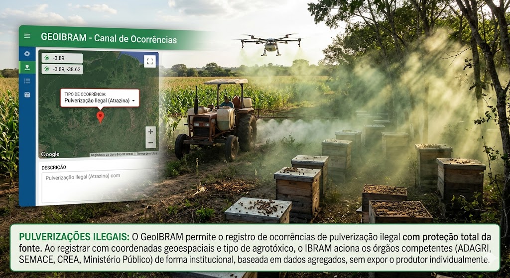 O MAPA/CE tem 4 fiscais para todo o estado. Os órgãos estaduais com competência para agir são: ADAGRI (uso no campo), SEMACE (comercialização) e CREA (receituário). Para acionar esses órgãos com eficácia, o apicultor ou meliponicultor precisa estar cadastrado no GeoIBRAM — plataforma gratuita em geoibram.com. Ocorrências registradas na plataforma são tratadas com sigilo total da fonte: o IBRAM age institucionalmente, sem expor quem registrou.